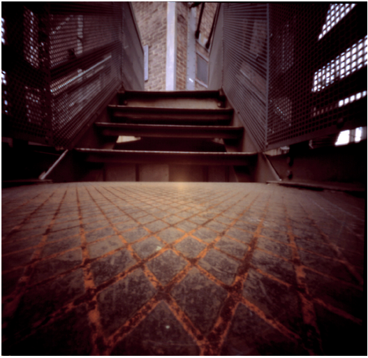 Eines meiner ersten Pinholebilder zeigt den Blick über einen rostigen Metallboden hinauf zu einer schmalen Treppe, flankiert von Gitterwänden. Ich legte die Kamera so tief, dass der Boden fast den ganzen Vordergrund füllt, seine Linien wie ein Netz, das mich hineinzieht. Das Licht kommt nicht aus einer klaren Quelle – es scheint zu fließen, weich, und legt sich wie ein feiner Schleier über die Härte des Metalls.