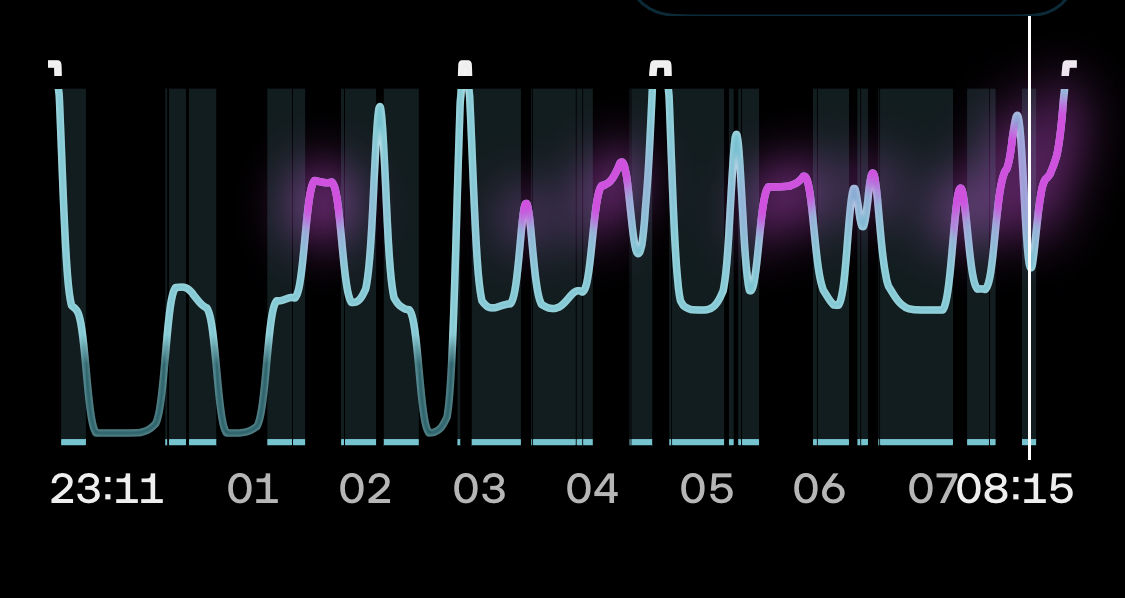 Die Kurve zeigt, was ich am Morgen gespürt habe: Ich konnte wieder durchschlafen. Es gab Tiefschlafphasen, REM-Phasen, Wachmomente – wie es bei jedem Menschen üblich ist. Aber der Unterschied war, dass sich der Schlaf rhythmisch, vollständig und erholsam anfühlte. Das Bild ist für mich mehr als eine technische Aufzeichnung. Es ist ein sichtbares Echo meines Körpers, ein Beweis dafür, dass die feine Balance stimmt.