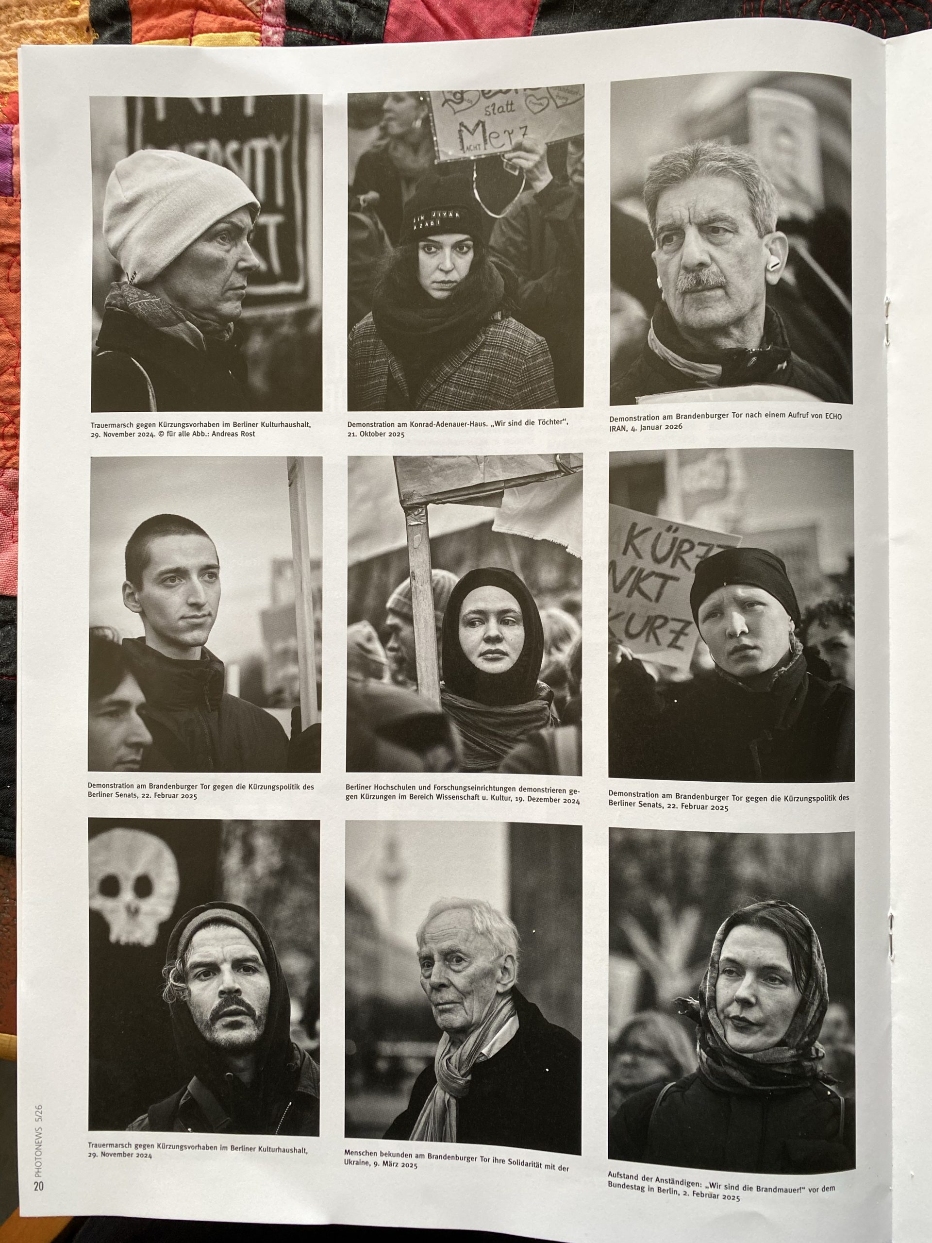 Wie immer freute ich mich, endlich Zeit zu haben für die neueste Ausgabe der PhotoNews. Beim ersten Durchblättern blieb ich an einer Seite hängen: Portraits von Demonstrierenden – Portraits im öffentlichen Raum, einzeln aufgenommen, nah, konzentriert. Solche Portraits kenne ich. Ich habe selbst über Jahre Personen im öffentlichen Raum fotografiert – Portraits, die aus der Situation heraus entstehen, ohne erklärenden Kontext.